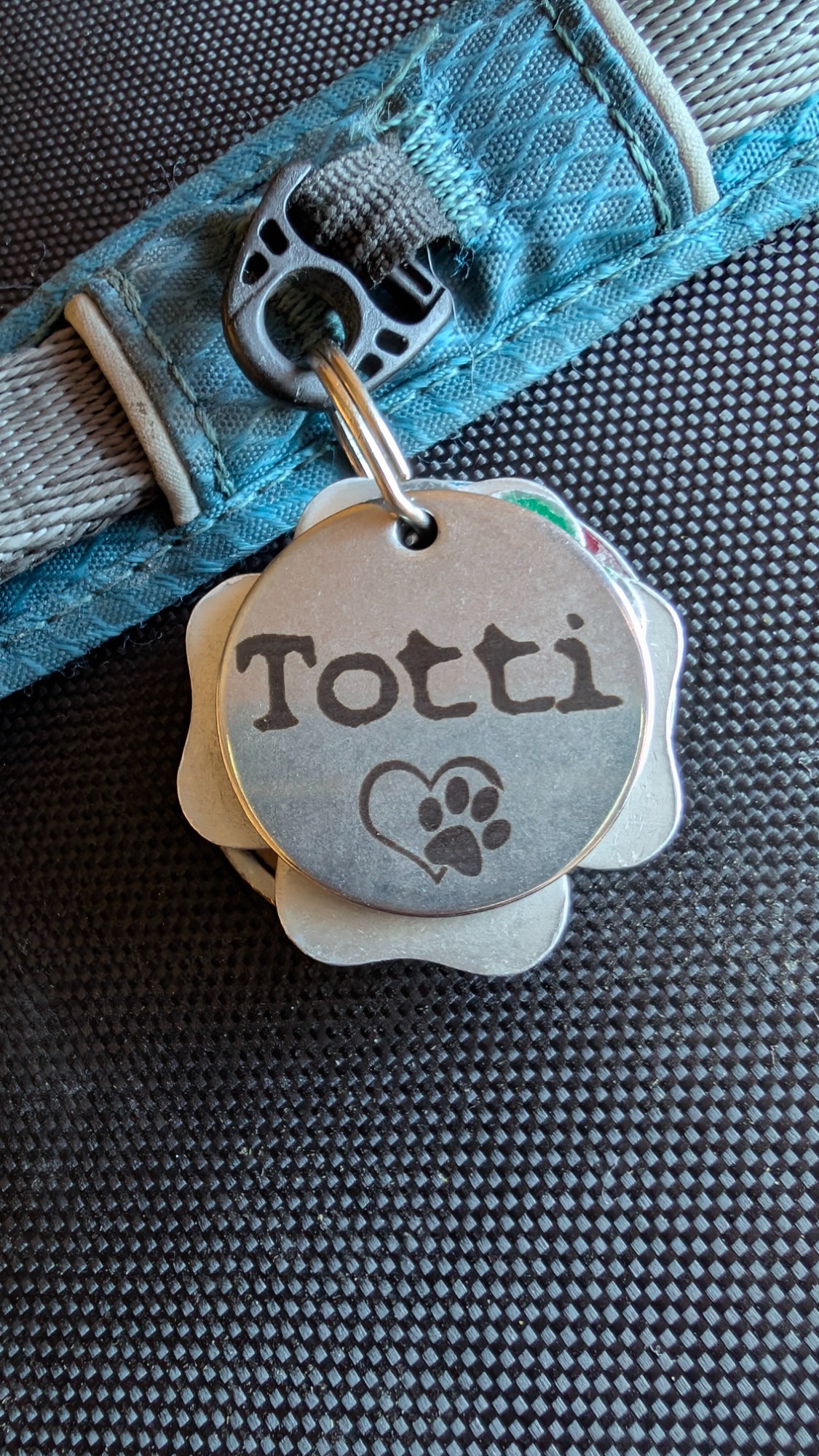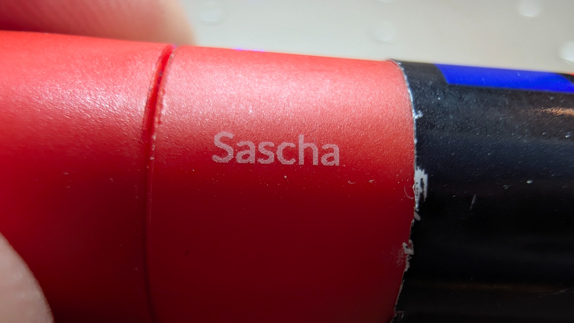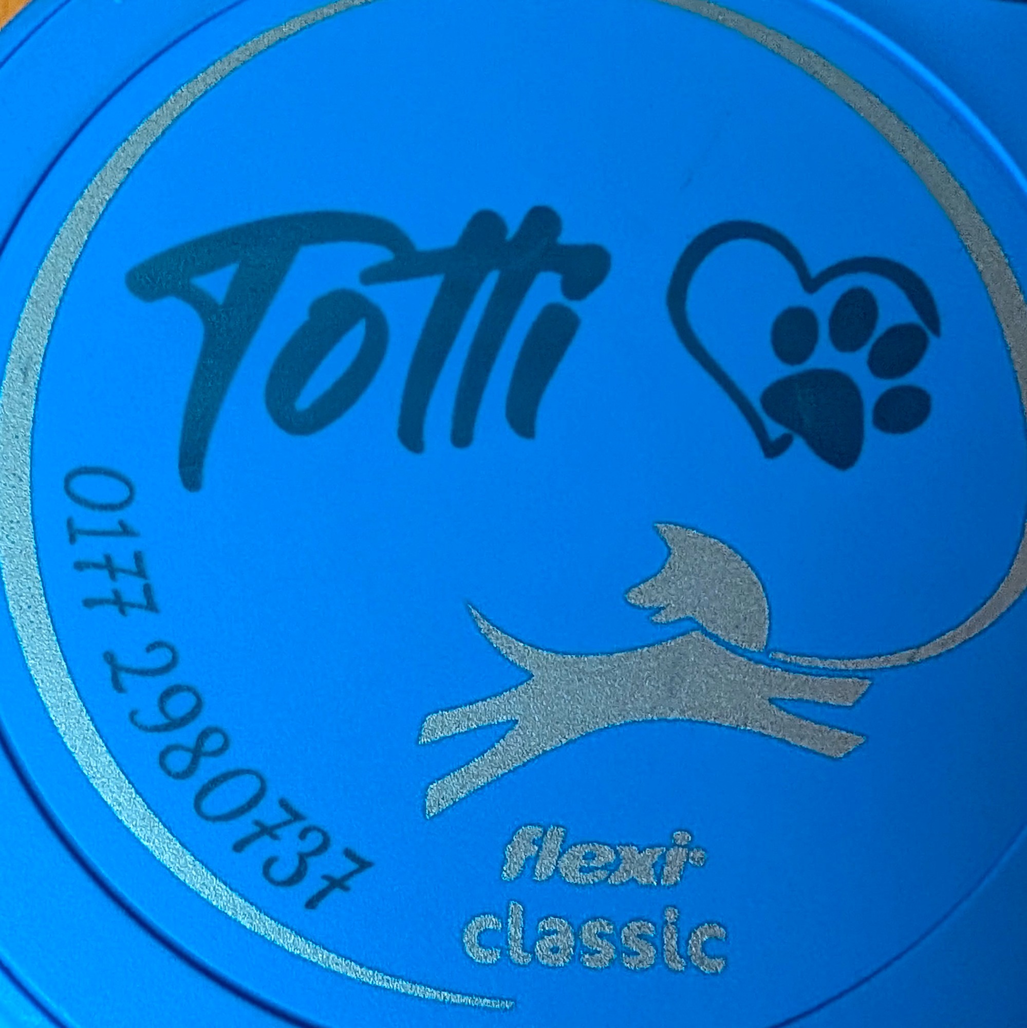 Auf dieses Gehäuse einer Rollleine habe ich den Namen meines Hundes und meine Telefonnummer aufgelasert.