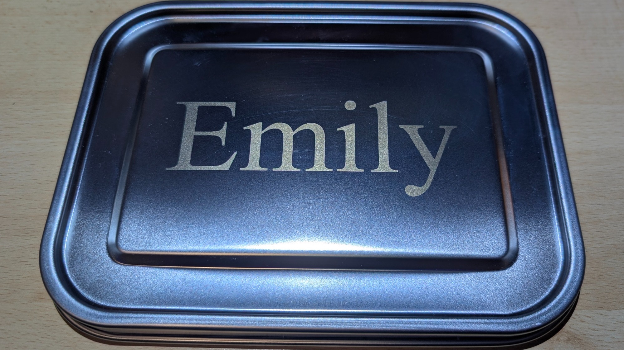 Dein Name auf einer Lunchbox? Sieht edel aus und hält ewig. Auch handschriftliche Vorlagen sind möglich.