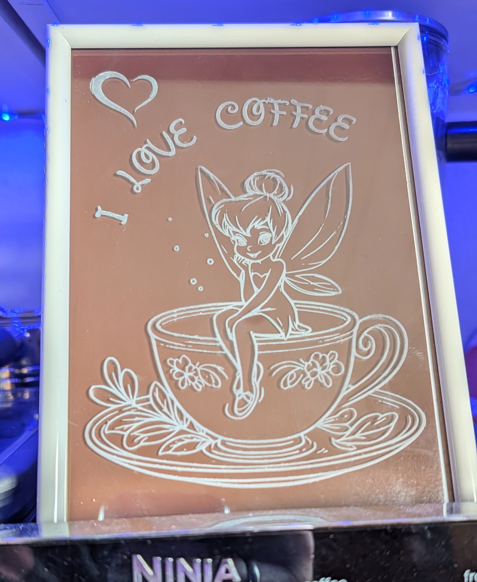 Ein einfacher Glasbilderrahmen, ein passendes Motiv und eine geeignete Folie als Kontrast. Fertig ist ein Unikat für die Kaffeemaschine.